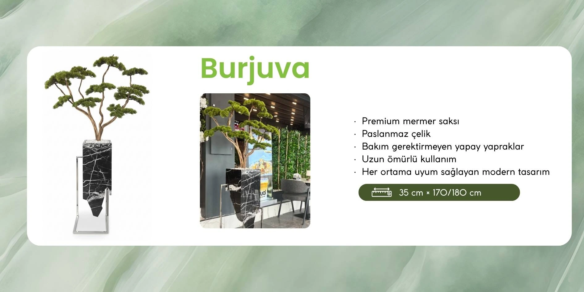 Burjuva, gerçeğinden ayırt edilemeyecek kadar doğal görünüme sahip dekoratif premium yapay bonsai ağaç tasarımıdır. Yaşam alanlarınıza estetik ve doğallığı bir arada sunar.