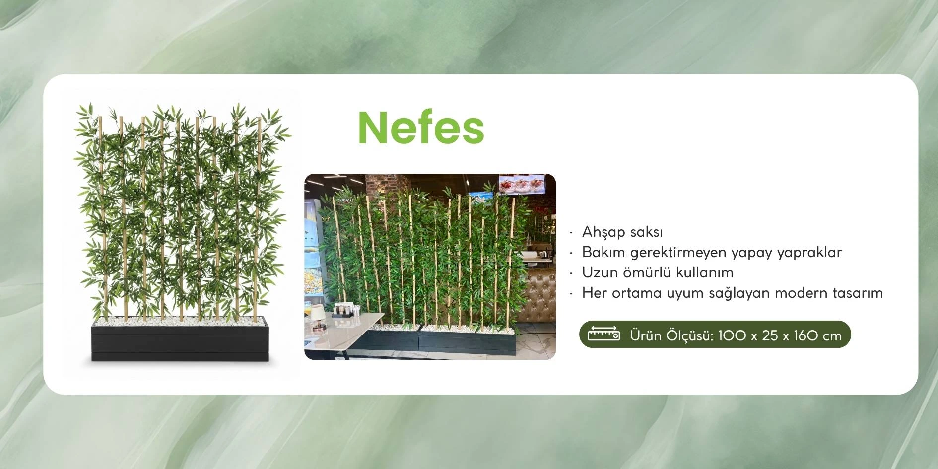 Nefes, gerçeğinden ayırt edilemeyecek kadar doğal görünüme sahip dekoratif premium yapay ağaç tasarımıdır. Yaşam alanlarınıza estetik ve doğallığı bir arada sunar.