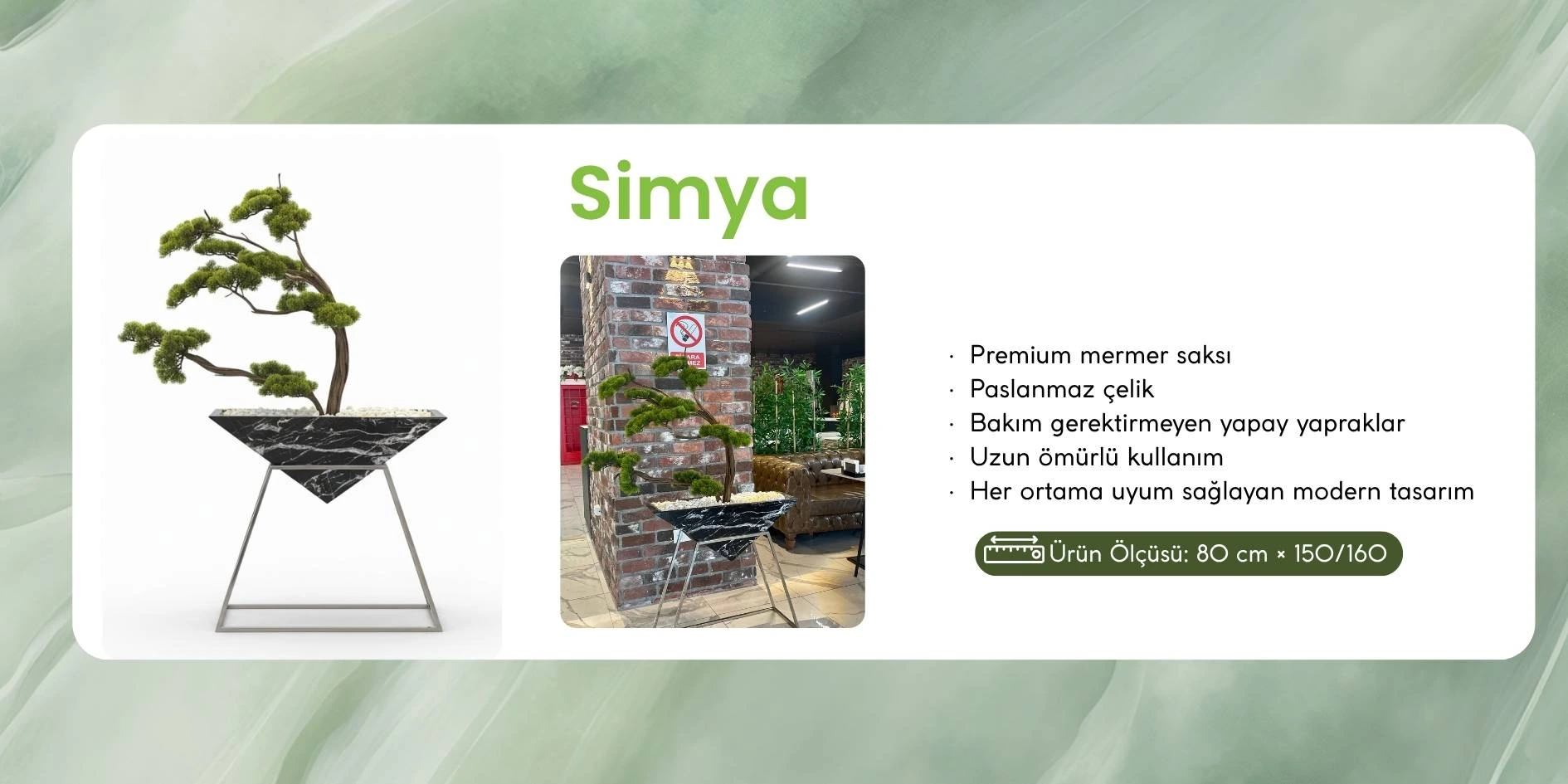 Simya, gerçeğinden ayırt edilemeyecek kadar doğal görünüme sahip dekoratif premium yapay bonsai ağaç tasarımıdır. Yaşam alanlarınıza estetik ve doğallığı bir arada sunar.
